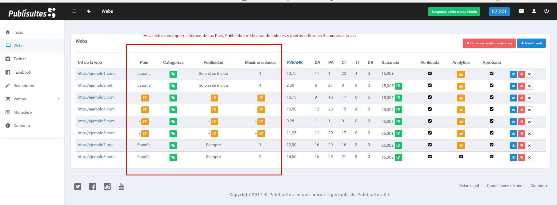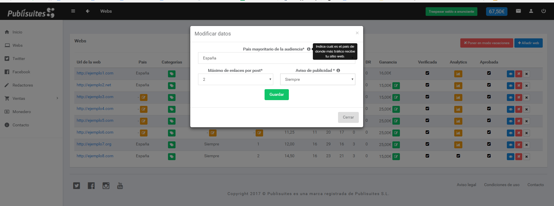 Para ello tenéis que ir a webs -> https://www.publisuites.com/publishers/websites/ y veréis esta pantalla: