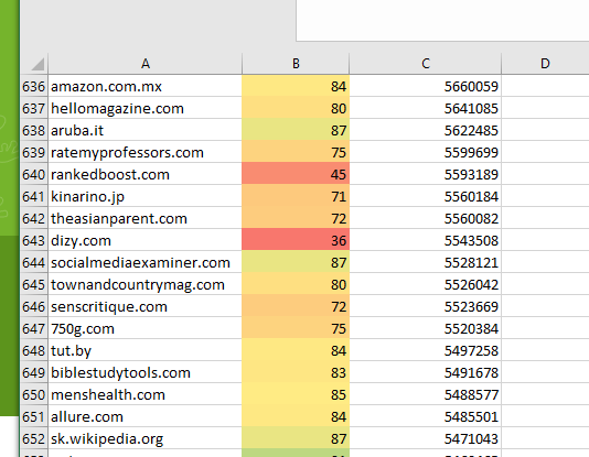 Ahora puedes ordenar, por ejemplo, por tráfico, y poner una escala de color al valor del dominio para comprobar que webs tienen mucho tráfico con un DR bajo, señal de que probablemente no tengan un perfil de enlaces muy fuerte.