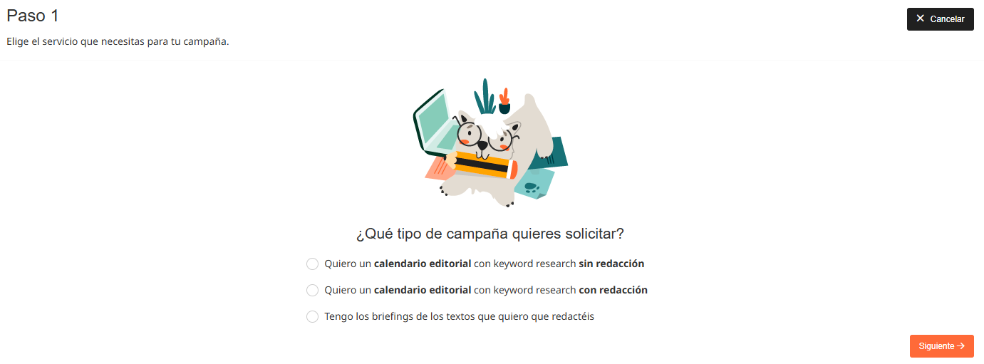 Una vez que hayas indicado que deseas realizar una campaña de redacción de artículos, tendrás que seleccionar una de estas tres opciones: