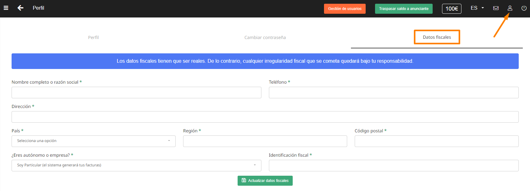Es muy importante que rellenes los datos fiscales en tu perfil. Necesitamos que esos datos sean reales ya que figurarán en las facturas que se generen cuando pidas un pago.