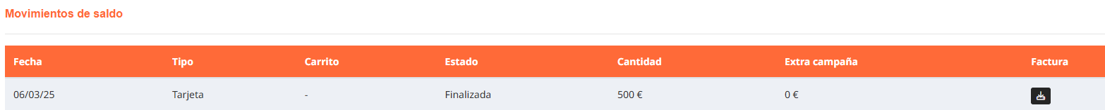 Comprobarás los movimientos de tu saldo y en la parte derecha verás un botón negro. Desde ahí puedes descargarte la factura.
